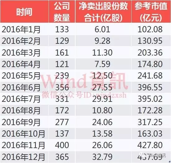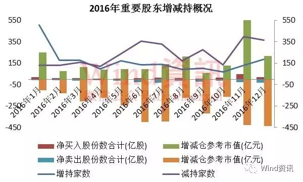 从单月情况看,2016年11月份减持公司最多,达到了400家;而12月重要股东净卖出32.79亿股,参考市值437.69亿元,均是全年最高。