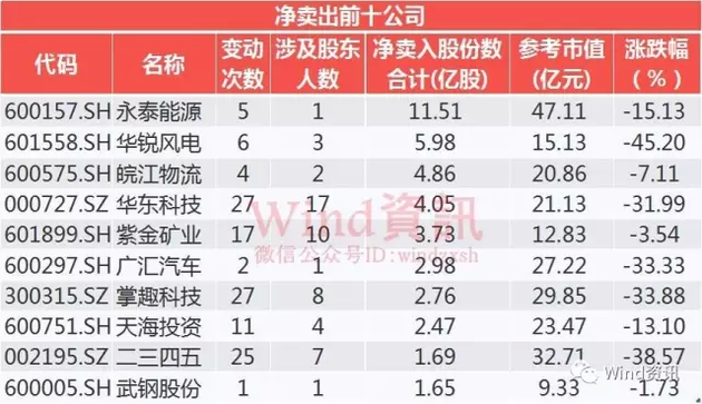 2016年净卖出的公司中,净卖出超过1亿股的共22家,净卖出超过2亿股的8家。其中,永泰能源净卖出超过10亿股,大幅领先其他公司。
